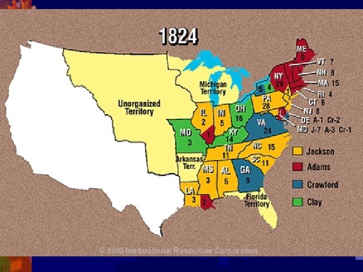 Election of 1824 • All candidates were Republican, but all were from different sections of the U. S. • Candidates • • John Quincy Adams – Massachusetts – Northeast William Crawford – Georgia – South Henry Clay – Kentucky – West Andrew Jackson – Tennessee – Old Southwest • No candidate won a majority and the vote went to the House of Reps. • Clay had fewest votes and was out & Crawford dropped out due to illness • Adams & Jackson were the remaining candidates • Jackson won the most popular and electoral votes in the election & felt like he would win in the House • Henry Clay was Speaker of the House of Reps. and used his influence to swing the vote in favor of John Quincy Adams • Clay was later named Sec. of State under Adams and Jackson accused them of making a secret deal which he