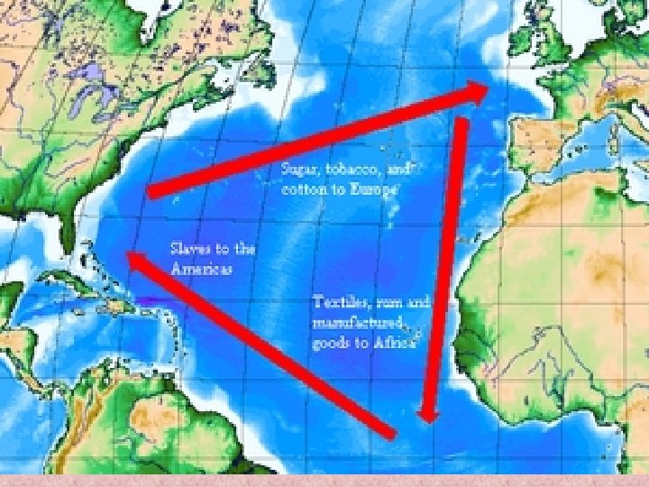Triangular Trade • The transatlantic system of trade • in which goods and people, including slaves, were exchanged • between Africa, England, Europe, The west Indies, and the colonies in North America.