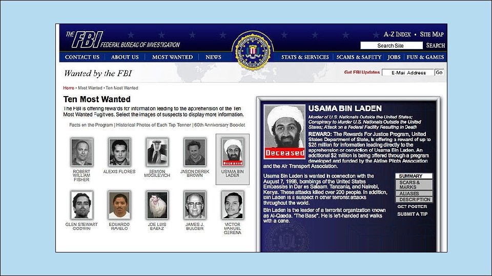 The End • On May 2, 2011, at 1: 00 am, Navy SEALS raided Osama bin Laden’s compound in Pakistan. • Bin Laden was shot and killed in the raid. • His body was taken to Afghanistan for identification, then buried at sea within 24 hours. • According to U. S. officials, bin Laden was buried at sea because no country would accept his remains.