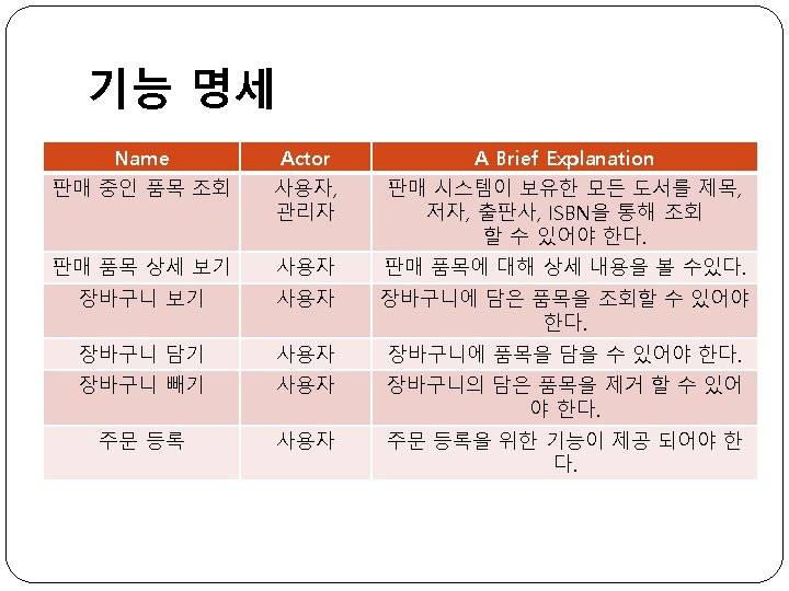 Use Case Descriptions - 계속 Use case name 장바구니 빼기 Participating actor 사용자 Entry condition 1. 장바구니UI가 활성화되어있어야 한다. 2. 삭제할 품목을 선택한다. Flow of events 3. 빼기 버튼을 클릭한다. 4. 결과를 확인한다. Exit condition