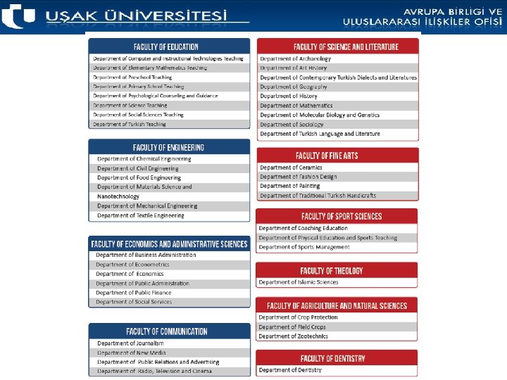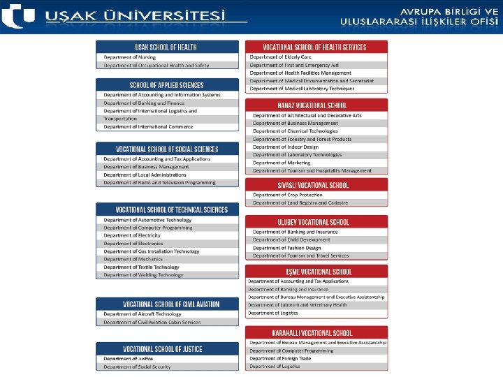 Degree Programmes Undergraduate and postgraduate education at Uşak University is organized and administered in accordance with the related higher education laws and regulations taken by the Higher Education Council of Turkey. There are 12 faculties, 3 vocational schools providing undergraduate education, 11 vocational colleges providing pre-undergraduate education, 3 institutes providing postgraduate education and 27 research application centers. University buildings are located on the main campus. UŞAK UNIVERSITY | EU & International Relations Office 2018