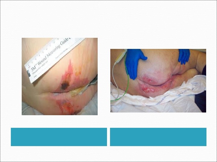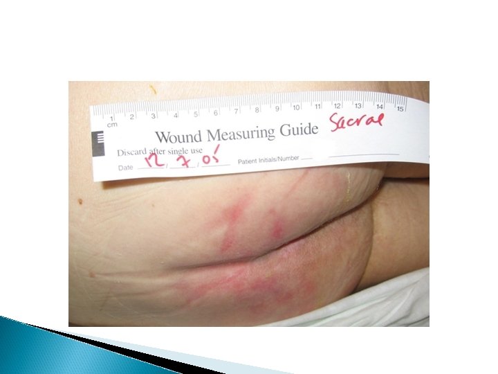 Is it a pressure ulcer? Definition: Damage caused to skin and underlying soft tissue by unrelieved pressure when the tissue is compressed between a bony prominence and external surface over a prolonged period of time 3 main contributing factors in formation: Pressure, Shear and Friction Most pressure ulcers are over a bony prominence, however, they may be present over soft tissues. Keypoint: assess over bony areas AND under medical devices (SCDs, oxygen prongs and tubings, foleys, drains, objects left in bed, etc. )