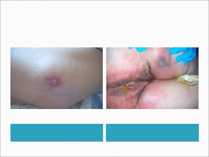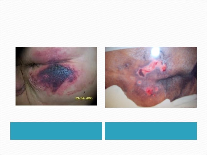 Deep tissue injury Purple or maroon localized area of discolored intact skin or blood filled blister due to damage of underlying soft tissue from pressure or shear. Area may be preceeded by tissue that is painful, firm, mushy, boggy, warmer or cooler as compared to adjacent tissue. Evolution may appear as a thin blister over a dark wound bed, may progress to eschar and further opening. Depth unknown. May or may not be reverseable. Keypoint: must monitor carefully. Use NONadhesive dressings to protect.