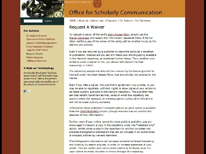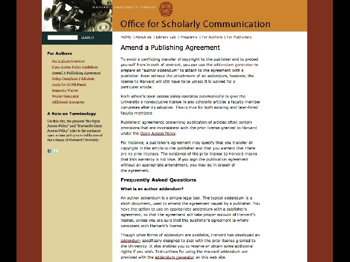 Benefits of Open Access for Faculty and Society • Increases visibility, usage, and impact of research. • Fuels innovation, discovery, and progress. • Allows Faculty to retain control over their publications. • Allows Faculty to use derivatives of their own work freely. • The Public gets a return on its investment (i. e. , results of funded research is freely accessible and not behind costly barriers). • Promotes knowledge and free expression as a public good. • Supports our mission of teaching and learning. • Offers potential savings for libraries and Institutions. • Creates free market forces and competition for publishers.