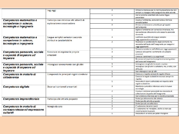Competenza multilinguistica Riconosce e sperimenta la pluralità dei linguaggi 2 3 2 22 1 Competenza matematica e competenze in scienze, tecnologie e ingegneria Esegue semplici seriazioni secondo attributi e caratteristiche Partecipa con interesse alle attività di esplorazione e osservazione 24 3 3 2 2 1 1 24