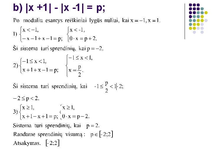 Modulinių lygčių su parametru sprendimas. 97. Su kuriomis p reikšmėmis lygtis turi bent vieną sprendinį: a) |x -1| + |2 x - 3| = p; Po moduliu esantys reiškiniai lygūs nuliui, kai x =1, 5. Šie taškai skaičių tiesę padalina į tris intervalus. Nagrinėdami lygtį kiekviename iš šių intervalų gauname tris sistemas: 1)