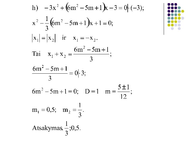 77. Su kuriomis m reikšmėmis lygties sprendinių moduliai lygūs, o patys sprendiniai yra priešingų ženklų: a) x² + (3 m - 5)x – 4 = 0;