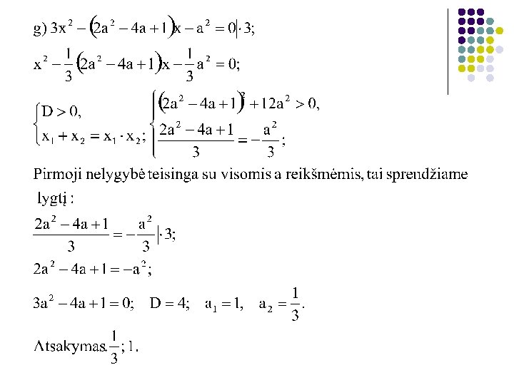 Tiesinės lygtys Tiesinė lygtis su vienu kintamuoju ir vienu parametru yra f(a)x = g(a). Galimi tiesinės lygties f(a)x = g(a) atvejai: l 1) kai f(a) ≠ 0, tai tiesinės lygties sprendinys l l 2) kai f(a)=0, g(a)=0, tada lygtis virsta 0 ·x = 0, o tada lygties sprendiniai visi skaičiai; 3) kai f(a)=0, g(a)≠ 0, tada lygtis virsta 0·x=g(a) ir lygtis sprendinių neturi.