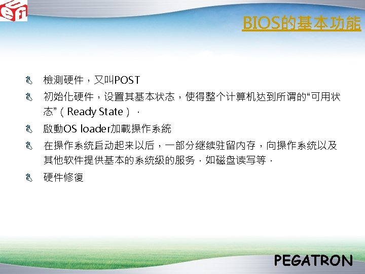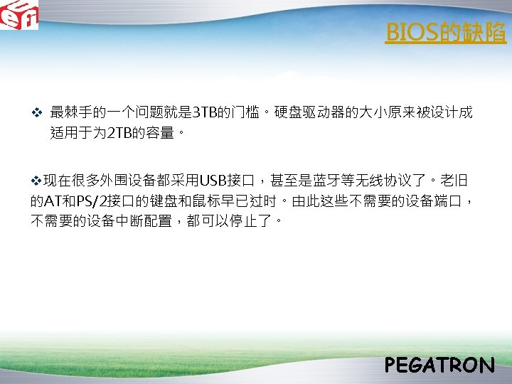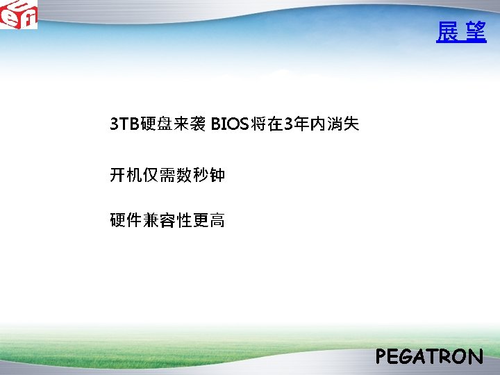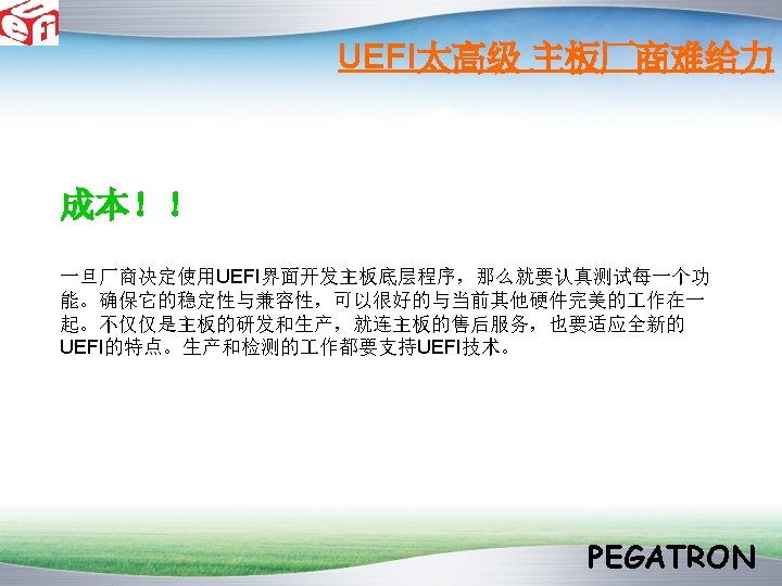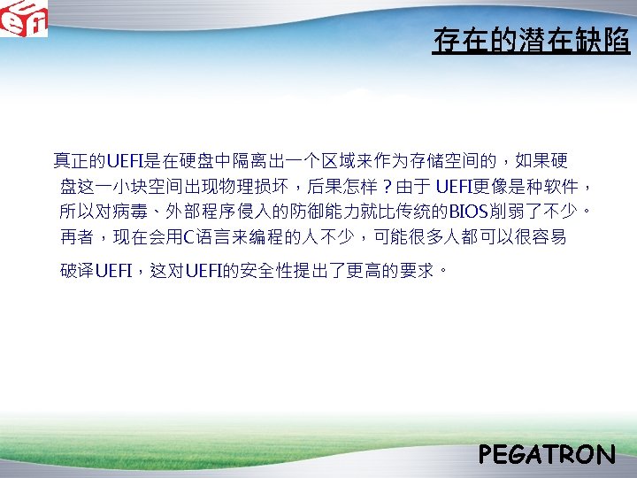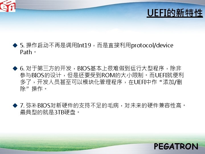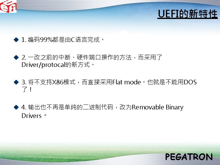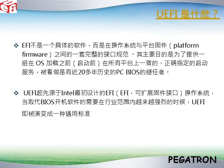 EFI &UEFI v The UEFI specification will be based on the EFI 1. 10 specification v the Unified EFI Specification will come from the Forum, not from Intel. v Intel still holds the copyright PEGATRON