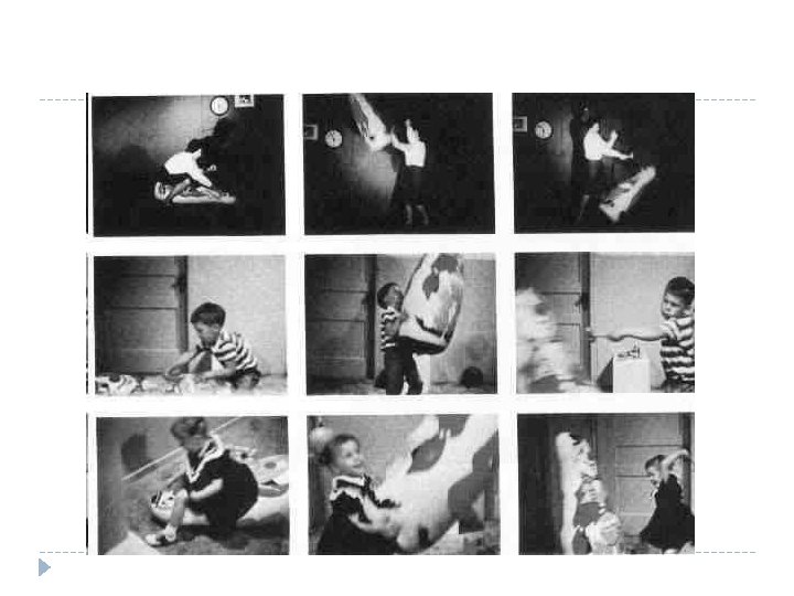 Bandurin eksperiment �Deca su posmatrala model kako se agresivno ponaša prema lutki zvanoj Bobo �U različitim situacijama model je nagrađen odnosno kažnjen za svoje ponašanje �Grupa dece je posmatrala neagresivni model �Kontrolna grupa nije posmatrala ponašanje modela �Zatim su deca puštena u sobu s igračkama u kojoj se nalazila i lutka Bobo �Da li su deca imitirala ponašanje modela?