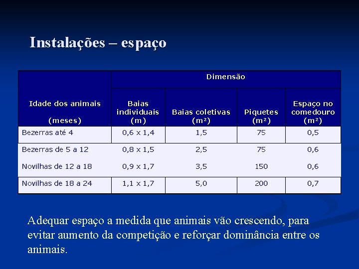 Instalações – espaço Dimensão Idade dos animais (meses) Baias individuais (m) Baias coletivas (m 2) Piquetes (m 2) Espaço no comedouro (m 2) Bezerras até 4 0, 6 x 1, 4 1, 5 75 0, 5 Bezerras de 5 a 12 0, 8 x 1, 5 2, 5 75 0, 6 Novilhas de 12 a 18 0, 9 x 1, 7 3, 5 150 0, 6 Novilhas de 18 a 24 1, 1 x 1, 7 5, 0 200 0, 7 Adequar espaço a medida que animais vão crescendo, para evitar aumento da competição e reforçar dominância entre os animais.