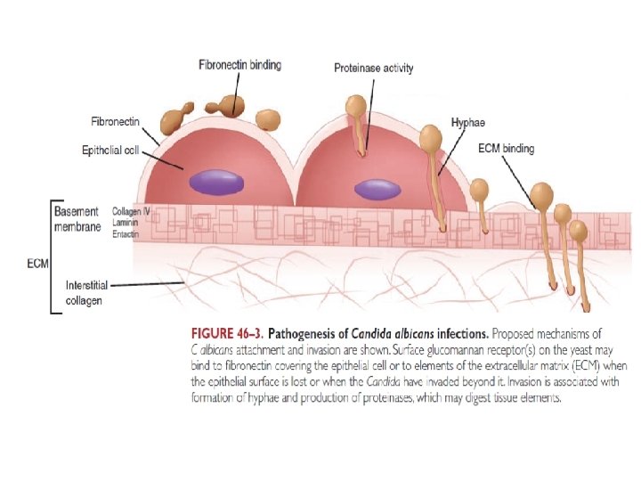 Pathogenesis • Hyphae form during invasion superficially or deep • Strong attachment to epithelium is via surface hyphal wall protein (Hwp 1) on germ tube/hyphae • Glucomanan receptors of Candida bind to fibronectin of epithelial cells (by yeast form) or extracellular matrix (ECM) as collagen, laminin and intactin e. g. by hyphal form during invasion. cont. /…