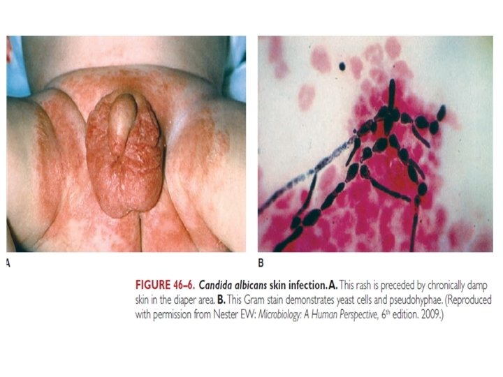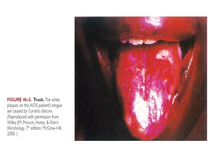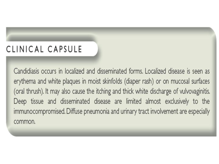 Clinical Aspects of Candidiasis • Superficial mm: White, cheesy plaque, painless (thrush); on tongue, palate, single or multiple - Vaginal Candidiasis: Thick, curd-like discharge and itching. Also, chronic/recurrent infections • Skin infections: In crural folds, wet, macerated, e. g. diaper rash - Recurrent immersion in water (dishwashers); erythematous, tender areas with fissures • Chronic mucocutaneous candidiasis with TH 1 defects cont. /…