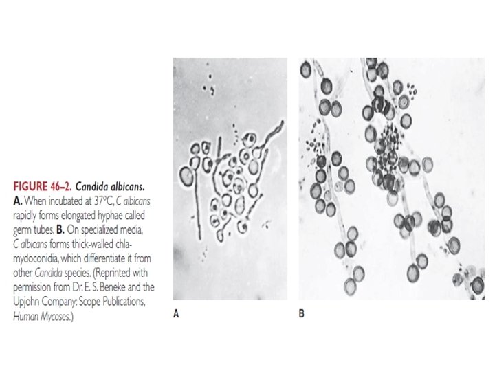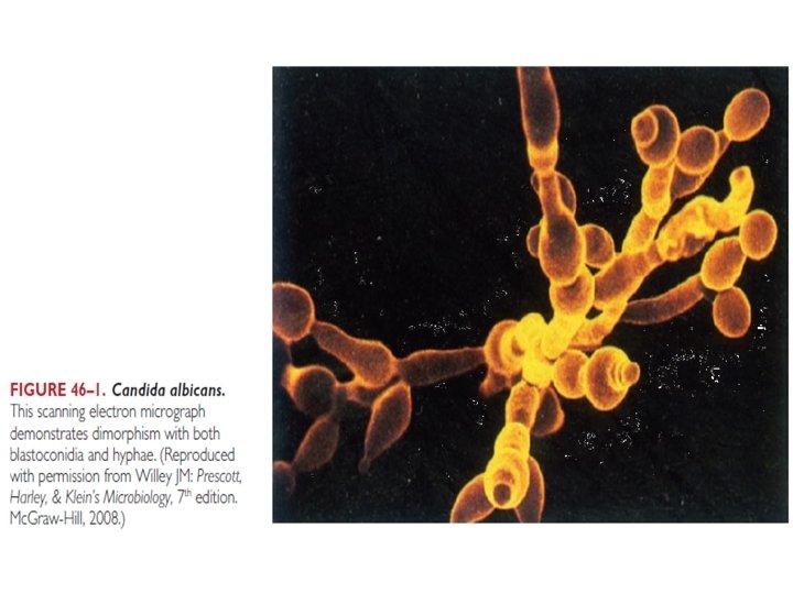 Candida albicans • Forms: - Yeast with budding (Blastoconidia) - Hyphae triggered by: Temp. 37 o. C, p. H # When attached to yeast as sprouts “outgrow” are called Germ Tubes # Hyphae may develop terminal thick-walled “Chlamydoconidia” - Elongated forms with restrictions (Pseudo-hyphae) • Cell wall: Includes surface mannoproteins
