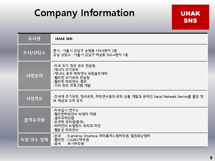 UHAK Social Network Service Every UHAK what you Slides: 11 Download presentation UHAK Social Network Service Every UHAK what you think INDEX I. Company Information II. Company History III. Compatitiveness IV. Collaboration V. Marketing Strategy 3 4 5 6 7 2 Thank you www. uhaksns. com 대표 : 김영각 Tel: 070 -7796 -0565 Kakao ID : uhaksns@naver. com 서울시 강남구 역삼동 우인빌딩 7층