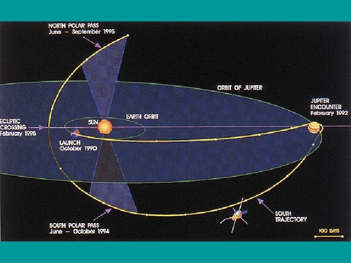 • The Ulysses mission is a joint mission with NASA and ESA to explore the solar environment at high ecliptic latitudes. It was launched 6 October 1990, and reached Jupiter for its "gravitational slingshot" in February 1992. It passed the south solar pole in June 1994 and crossed the ecliptic equator in February 1995. In addition to its solar environment instruments, Ulysses also carries plasma instruments to study the interstellar and Jovian regions, as well as two instruments for studying X-rays and gamma-rays of both solar and cosmic origins.