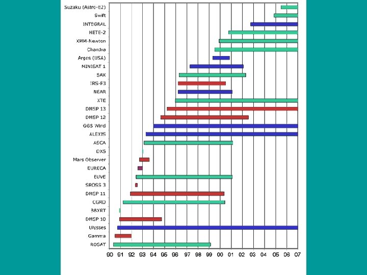 ASCA (Advanced Satellite for Cosmology) • The ASCA X-ray observatory, (Japan and US) launched in 1993, was especially designed to study the detailed distribution of X-rays with energy, which provide important information about the elements that make up the hot X-ray emitting gas.