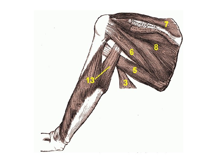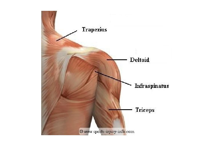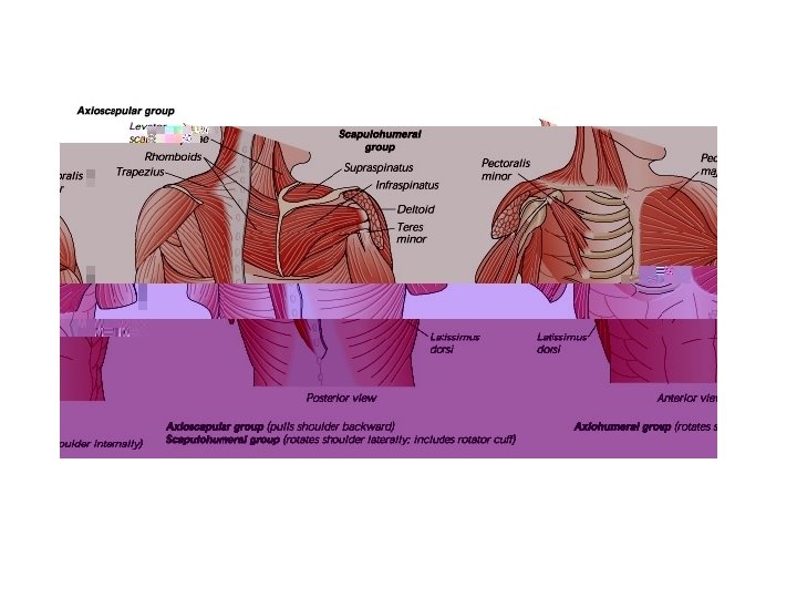 A. Anterieurs: • Grand pectoral (pectoralis major) • Petit pectoral (pectoralis minor) • Sous-clavier (subclavicularus) B. Posterieurs: • Trapèze (trapezius) • Angulaire de l’omoplate (levator scapulae) • Rhomboïde (romboideus) • Sous-scapulaire (subscapularis) • Sus-épineux (supraspinatus) • Sous-épineux (infraspinatus) • Petit rond (teres minor) • Grand rond (teres major) • Grand dorsal (latissimus dorsi)