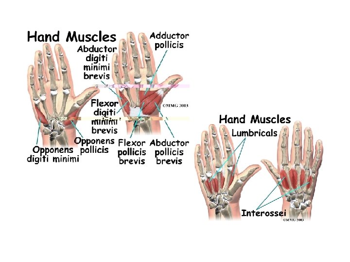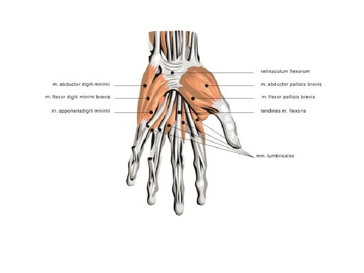 A. REGION PALMAIRE MOYENNE Lumbricaux (4) Interosseux: palmaires (3) et dorsaux (4) Innervation : N. median, N. cubital ( eminence hypothenar, derniers 2 lumbricaux, interosseux, court abducteur et le faissceau profond du court flechisseurs du pouce) Vascularisation : A. radiale, A. cubitale