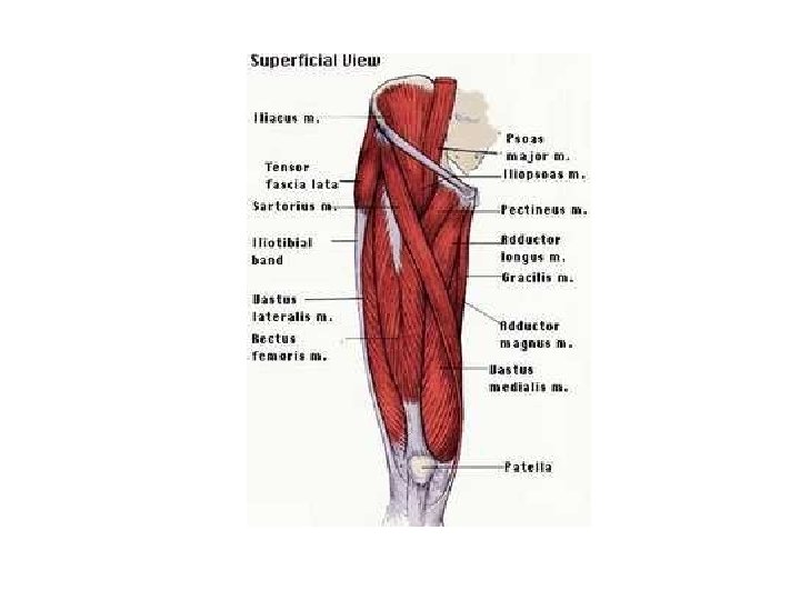 MUSCLES DE LA CUISSE Région antérieure – extenseur jambes sur la cuisse a. femurale • Extenseur du fascia latéral (tensor fasciae latae) Innervation : N. fessier superieur (plex S) • Sartorius (sartorius) – flexeur, abducteur, rotateur externe Innervation : n. crural (plex L) • Quadriceps crurale (quadriceps femoris) - Drept anterior (rectus anterior) - Vast intern (vastus medialis) - Vast extern (vastus lateralis) - Crural (vastus intermedius) - Extenseur de la jambe sur la cuisse Innervation : n. cvadricepsului din n. crural (plex L)