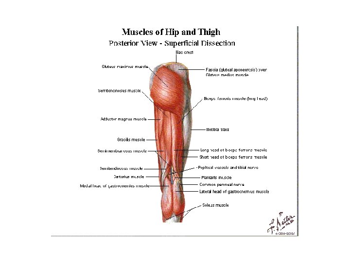 Région postérieur (ischio-jambiers) – Flexeurs de la jambe • Biceps crural (biceps femoris) rotateur externe Innervation : N. grand sciatique • Semi tendineux (semitendineus) rotateur interne Innervation : N. grand sciatique • Semi membraneux (semimembranosus) rotateur interne Innervation : N. grand sciatique