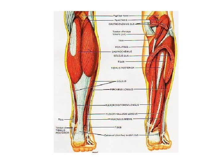 Région externe – rotation externe de la jambe • Long peroné latéral (peroneus longus) • Court peroné latéral (peroneus brevis) Innervation : N. musculo-cutané de la jambe (plex S) Vascularisation : A. peronier