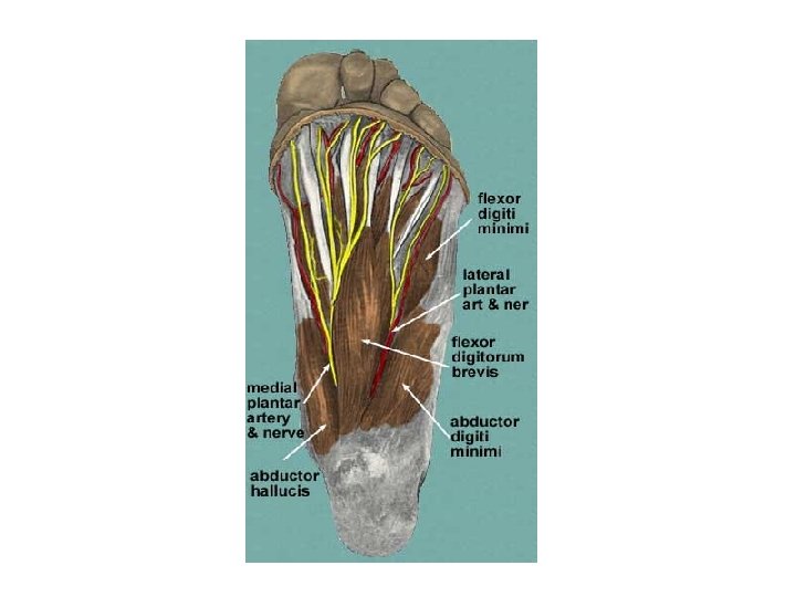 Loge plantaire Moyenne • Court flexeur plantaire (flexor digitorum brevis) innervation : n. plantaire interne • Accesor long flexeur commun (quadratus plantae) inerva]ia: n. plantar intern • Lombricali (lumbricales) Inervation : 2 premiers plantaire interne 2 derniers • plantaire externe Interoso[i (interossei dorsales, interossei plantares) Innervation : n. plantaire externe