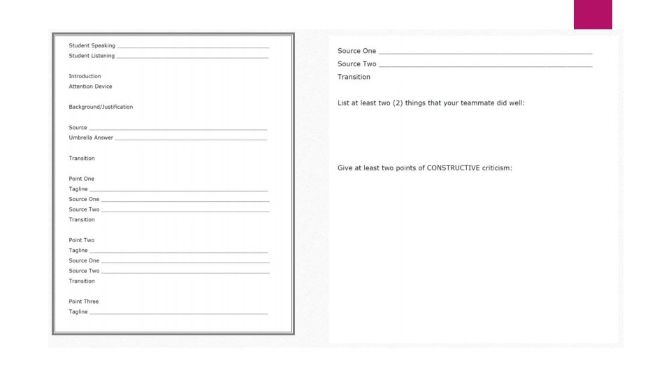 Creating Extemp Team Step One Step Two Step Three Set expectations early Understand the early problems Creating a Team Debate students make great extempers Know student conflicts The problem: Extemp is seen as an “individual” event Create a team handbook Practice requirements Grade requirements Dress code How to sign up for tournaments Consequences for drops Behavior standards and consequences for misbehavior Students will dislike the event, DO NOT LET THEM GIVE UP Make “filing” a group job Create student captains or mentors Students listen and critique each other Students watch one another at tournaments Students hold each other accountable for attending practice and tournaments