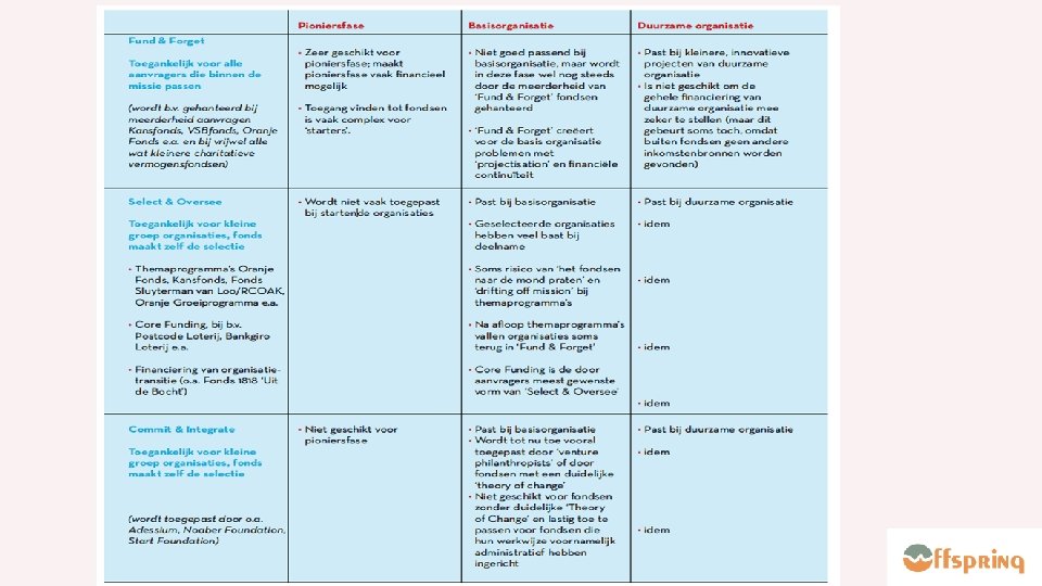 Pioniersorganisatie • Focus op interventie en project • Pionier(s) bouwt en bepaalt • Korte termijn financiering Basisorganisatie • Focus op organisatie • Pionier krijgt andere rol • Toezicht en procedures • Zoektocht nieuwe financieringsbronnen Duurzame organisatie • Aandacht voor juiste mensen, missie en passie • Issues rond groei en structuur organisatie • Duurzame financiering • Impact bewijzen