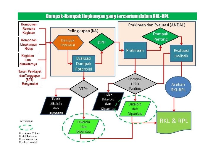 RKL RPL • Cek apakah telah memuat upaya untuk menangani dampak dan memantau komponen lingkungan hidup yang terkena dampak terhadap keseluruhan dampak, bukan hanya dampak yang disimpulkan sebagai dampak penting dari hasil evaluasi dampak. Untuk dampak yang disimpulkan sebagai bukan dampak penting, namun tetap memerlukan direncanakan untuk dikelola dan dipantau (dampak lingkungan hidup lainnya), maka tetap perlu disertakan rencana pengelolaan dan pemantauannya dalam RKL-RPL. • Cek apakag RKL telah menguraikan bentuk-bentuk pengelolaan lingkungan hidup yang dilakukan untuk menghindari, mencegah, meminimisasi dan/atau mengendalikan dampak negatif dan meningkatkan dampak positif. • Cek RPL apakah telah diuraikan rencana pemantauan dalam bentuk matrik atau tabel untuk dampak yang ditimbulkan