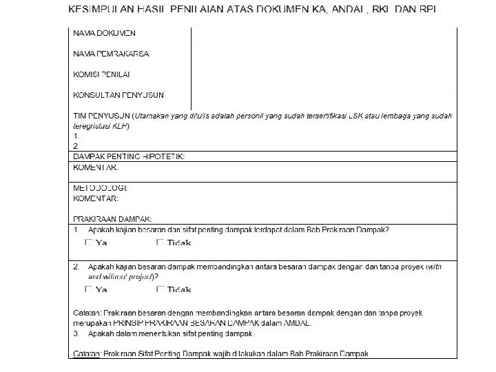 Evaluasi Dampak Penting • Cek apakah telah diuraikan hasil evaluasi atau telaahan keterkaitan dan interaksi seluruh dampak penting hipotetik (DPH) • Cek apakah metode evaluasi dampak yang tercantum dalam KA dipergunakan • Cek apakah telah ada perumusan arahan pengelolaan dan pemantauan lingkungan hidup yang menjadi dasar bagi penyusunan RKL-RPL • Cek apakah ada arahan pengelolaan yang dilakukan terhadap seluruh komponen kegiatan yang menimbulkan dampak, baik komponen kegiatan yang paling banyak memberikan dampak turunan (dampak yang bersifat strategis) maupun komponen kegiatan yang tidak banyak memberikan dampak turunan • Cek apakah ada arahan pemantauan dilakukan terhadap komponen lingkungan yang relevan untuk digunakan sebagai indikator untuk mengevaluasi penaatan (compliance), kecenderungan (trendline) dan tingkat kritis (critical level) dari suatu pengelolaan lingkungan hidup • Cek apakah ada kesimpulan yang memberikan pernyataan kelayakan lingkungan hidup atas rencana usaha dan/atau kegiatan yang dikaji