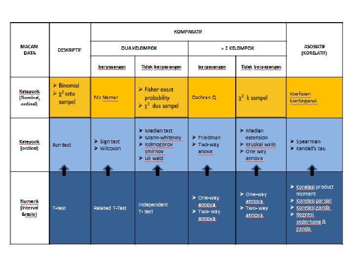 TABEL UJI HIPOTESIS KOMPARATIF MACAM DATA DUA KELOMPOK DESKRIPTIF berpasangan Kategorik (Nominal, ordinal) Kategorik (ordinal) Numerik (Interval &rasio) Tidakberpasangan Mc. Nemar Run test T-test Ø Sign test Ø Wilcoxon Related T-Test > 2 KELOMPOK berpasangan Tidakberpasangan Cochran Q Ø Median test Ø Mann-whiteney Ø Kolmogorovsmir nov Ø Ujiwald Independent T- test Ø Friedman Ø Two-way anova Ø Onewayannova Ø Two- way annova ASOSIATIF (KORELATIF) Koefisienkontingensi Ø Median extension Ø Kruskalwalis Ø One way annova Ø Onewayannova Ø Two- way annova Ø Spearman Ø Kendall’s tau Ø Korelasi product moment Ø Korelasiparsial Ø Korelasiganda Ø Regresisederhana &ganda