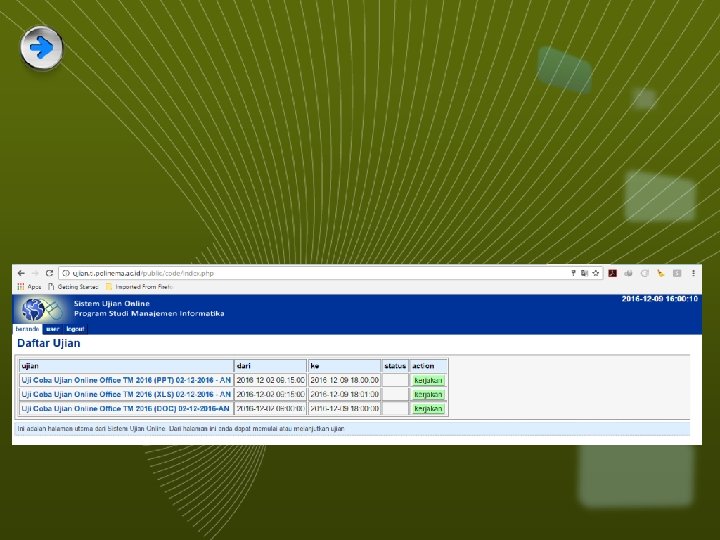 Petunjuk Pengerjaan Ujian Online Pada daftar ujian yang ada, silakan memilih ujian yang akan Anda kerjakan, dengan cara klik tombol “kerjakan”
