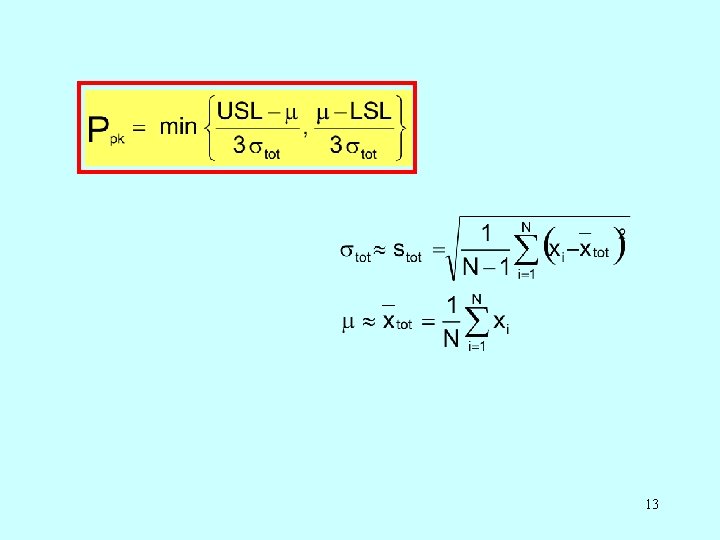 UKAZATELE VÝKONNOSTI Předpokládá se : normální rozdělení N( , ) sledovaného znaku jakosti; jeden náhodný výběr rozsahu N. Celková směrodatná odchylka stot charakterizuje celkovou variabilitu ve výběru N pozorování (pokud je výběr rozdělen do k podskupin stejného rozsahu n je N = k*n). 12