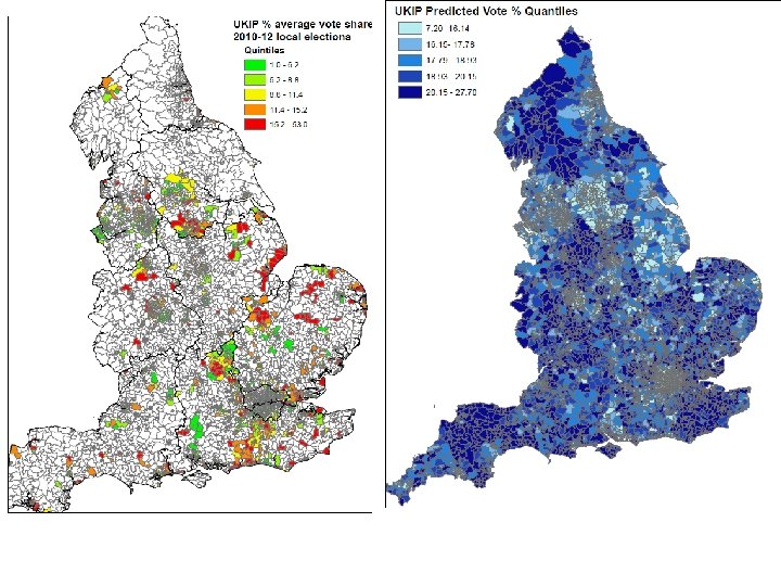 Data • Understanding Society survey – 3 waves of 40, 000 people, 2009 -12. – 460 UKIP supporters or voters – Lower sample, but concentrated 2009 -onward – longitudinal • Local Election Data, 2010 -12 – UKIP results in 1006 electoral wards of 2940 – Census predictors