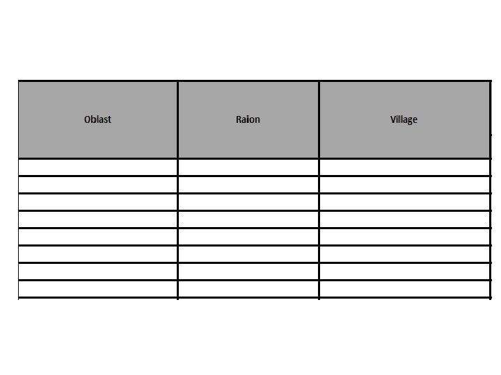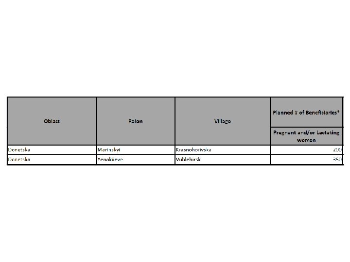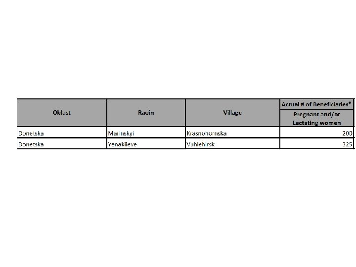 Practicum • Enter actuals for: Activity: “Distribution of Food: February 2015 – May 2015, Food” Month: February 2015 Geographical areas: Volnovaskyi: 500 Artmivsk: 550 Sloviansk: 350