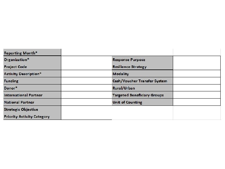 Planning Information What? - Planning Matrix Template When? - Whenever an agency has new activities - Whenever plans are modified How? - Complete Planning Matrix template and submit to frankline. echerue@wfp. org, cc elena. rovaris@wfp. org