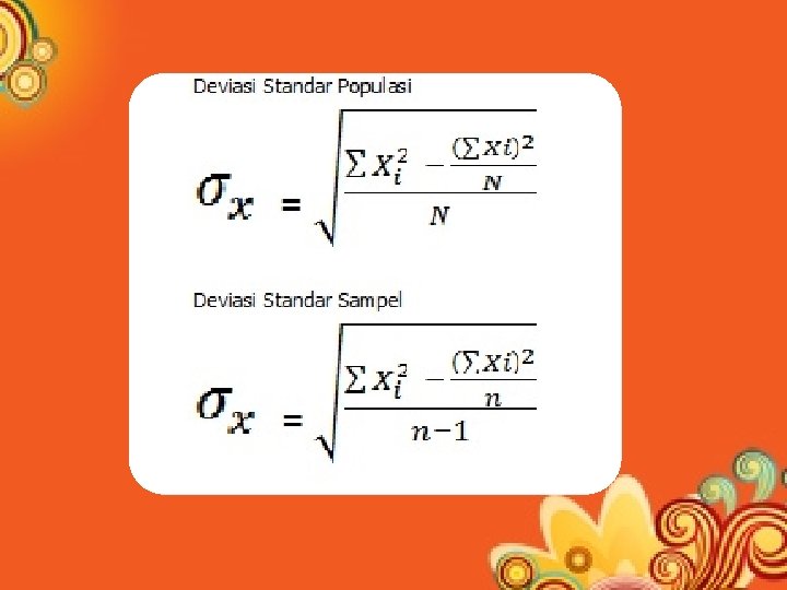 VARIANCE • Apabila dari sebuah populasi berukuran N. Kita mengukur variabel X yang tingkat pengukurannya minimal interval dengan hasil pengukuran X 1, X 2, X 3. . Xn, maka varians variabel X didefinisikan : • Varians populasi : • Varians sampel :