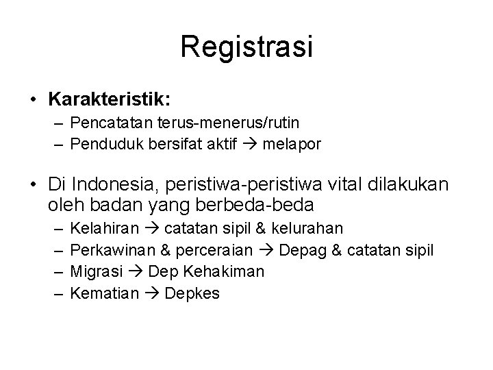 Registrasi • Registrasi: kumpulan keterangan mengenai terjadinya peristiwa lahir, mati serta segala kejadian penting yang merubah status sipil seseorang sejak dia lahir hingga mati. • Kejadian tsb: perkawinan, perceraian migrasi • Mencatat peristiwa-peristiwa penting statistik vital (vital statistics)