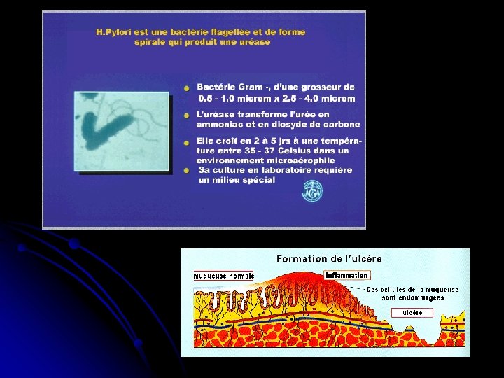 Rupture de l’équilibre agression/défense l Hélicobacter Pylori l Prise d’AINS l Autres facteurs Gram – On le retrouve dans 85% des ulcères Son réservoir: l’estomac humain Contamination dans l’enfance par voie oroorale Inhibent la Cyclo Oxygenase , qui a une action de défense de la muqueuse Tabac Hyperparathyroïdie Hypercalcémie