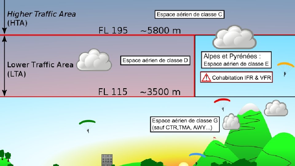 Les classes d’espaces aériens • En France, il n'y a pas d'espace aérien de classe B et F. • Depuis peu, il n'y a plus de CTR de classe E en France, c'est au minimum de la classe D. • Au-dessus du FL 115, c'est de la classe D partout. En théorie, les VFR peuvent demander une clairance pour voler au dessus du FL 115 ; en pratique le contrôle refuse les VFR. • Dans les EAC, tout changement de votre altitude ou de votre route doit faire l'objet d'une autorisation du contrôle.