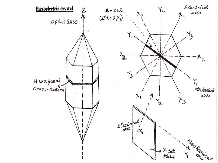Piezo-electric crystal : Natural quartz crystal has the shape of a hexagonal prism with a pyramid attached to each end. The line joining the apex points of the pyramids is the optic axis ( the z axis ). The three lines which pass through the opposite corners of the crystal constitute its three electrical axes ( the three X axes). The three lines which are the perpendicular to the sides of the hexagon form the mechanical axes (the Y axes). A thin plate of the crystal cut perpendicular to one of its X axes is known as an X – cut plate. A thin plate cut perpendicular to one of the Y axes is known as a Y-cut plate. An X-cut plate may be kept fixed between two parallel metal plates and a suitable a. c voltage may be applied across the metal plates. If the a. c voltage is applied along the electrical axis (Y axis), the crystal vibrates along the mechanical axis ( Y axis ).