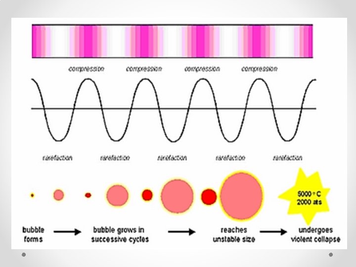 ACOUSTIC CAVITATION • cavitation is the phenomenon where small and largely empty cavities are generated in a fluid, which expand to large size and then rapidly collapse. When the cavitation bubbles collapse, they focus liquid energy to very small volumes. Thereby, they create spots of high temperature and emit shock waves. The collapse of cavities involves very high energies. ultrasound enhances chemical and physical changes in a liquid medium through the generation and subsequent destruction of cavitation bubbles.