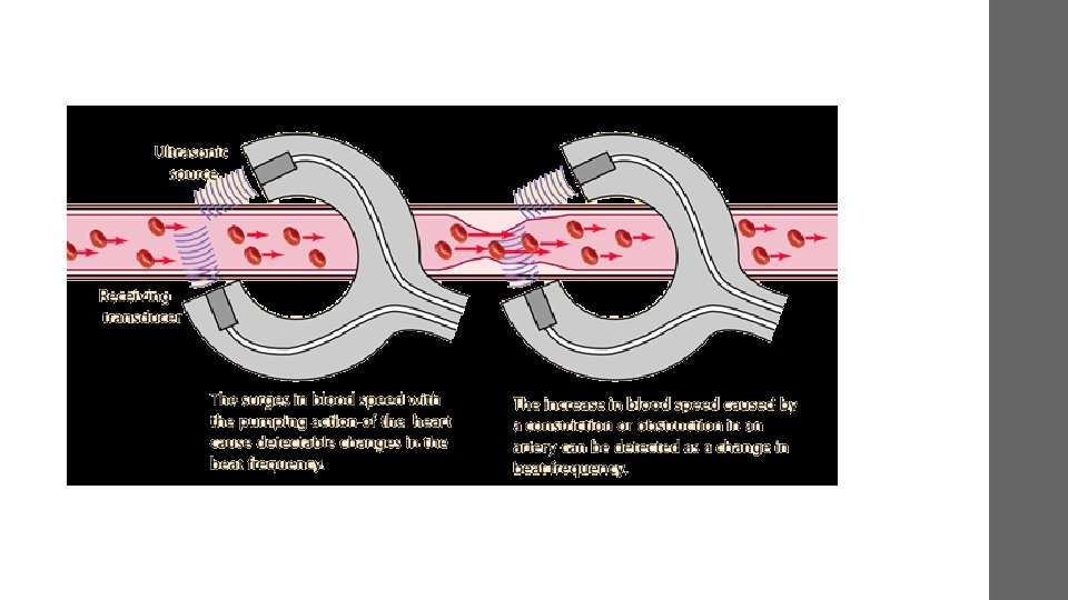 • the Doppler effect is used to measure blood flow velocity. • Ultrasound reflected from red blood cells will change in frequency according to the blood flow velocity. • When direction of blood flow is towards the transducer, the echoes from blood reflected back to the transducer will have a higher frequency than the one emitted from the transducer.