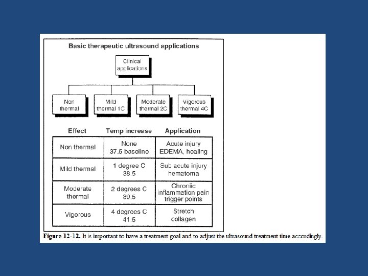 Contraindications • • • Acute conditions (continous output) Ischemic areas or impaired circulation areas Tendency to hemorrhage Around eyes, heart, skull, or genitals Over pelvic or lumbar areas in pregnant or menstruating females Cancerous tumors Spinal cord or large nerve plexus in high doses Anesthetic areas Stress fracture sites or over fracture site before healing is complete (continuous); epiphysis Acute infection