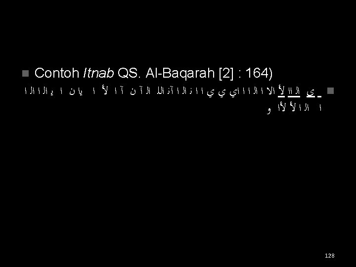 n Ijaz ( ﺍﻹﻳﺠﺎﺯ ) dan Itnab ( ﺍﻹﻃﻨﺎﺏ ) Ijaz ( memiliki makna yang lebih dari yang dipahami/mantuq), QS. Al-Baqarah : 275 ( ﺍﻧﻯ : 275 ( ﻥآ ﻥ ) ﺍ kesalahannya telah dima’afkan, bahkan dimasa lalu. n Teks : QS. Al-Baqarah[2]: 275 ﺍﻭﺍ ﺍ ﺍ ﺍﻟﻠ ﺍ ﺍﻟ ﺍ ﻥ آ ﻥ ﺍﻳ ﻟ ﺍﻟ ﺍ ﻻ ﻭﻭ ﻻ ﺍ ﻭ ﺍﻱ ﺍﻟ ﺍ ﺍ n ﺍﻧﻯ ﺍ ﻯ ﺍﻟﻠ ﺍ ﺍ ﺍﻟ ﺍ ﻳﺍ ﺍﻭ 126