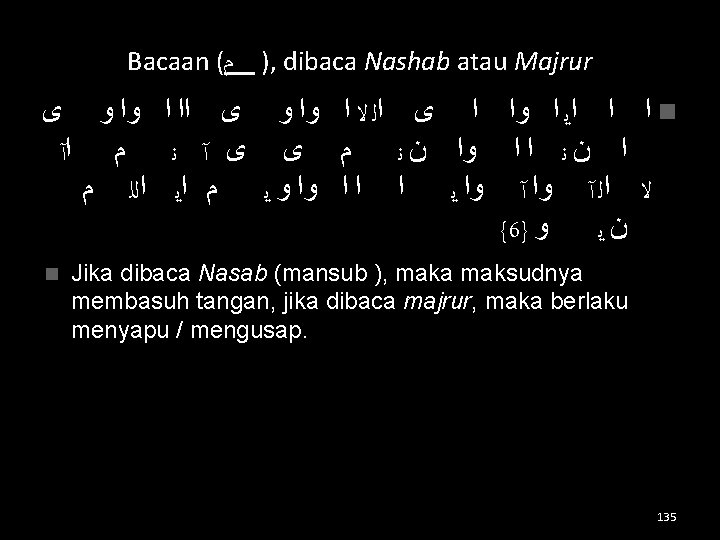 Contoh n ( ﺍﻟﻨﺴﺎﺀ ﻣﺴﺘﻢ ﻻ ): kata ( ﺍﻟﻠﻤﺲ ) adalah asalnya adalah ( ﺑﺎﻟﻴﺪ )ﺍﻟﻤﺲ : menyentuh dengan tangan. Kemudian di-idhafah-kan kepada kata al-nisa’ ( ﺍﻟﻨﺴﺎﺀ ) , maka maksudnya adalah jima’ ( berhubungan /sebadan) , karena sering digunakan dalam bahasa arab. Kemudian Al-Qur’an mengkinayahkan dengan istilah jima’. n n Juga contoh lain QS. Al-Maidah [5]: 6 ﺍﻳ ﺍ ﻭﺍ ﺍ ﻯ ﺍﻟ ﻻ ﺍ ﻭﺍ ﻭ ﻯ ﺍﺍ ﺍ ﻭﺍ ﻭ ﻯ ﺍ ﻥ ﻧ ﺍ ﺍ ﻭﺍ ﺍ ﺍ ﺍ ﻭﺍ ﻭ ﻡ ﺍآ ﻻ ﺍﻟ آ ﻭﺍ ﻳ ﻡ ﻯ ﻯ آ ﻧ { 6} ﻭ ﻥﻳ ﺍﻳ ﺍﻟﻠ ﻡ ﺍ ﺍ ﻥﻧ ﻡ ﻳ 134