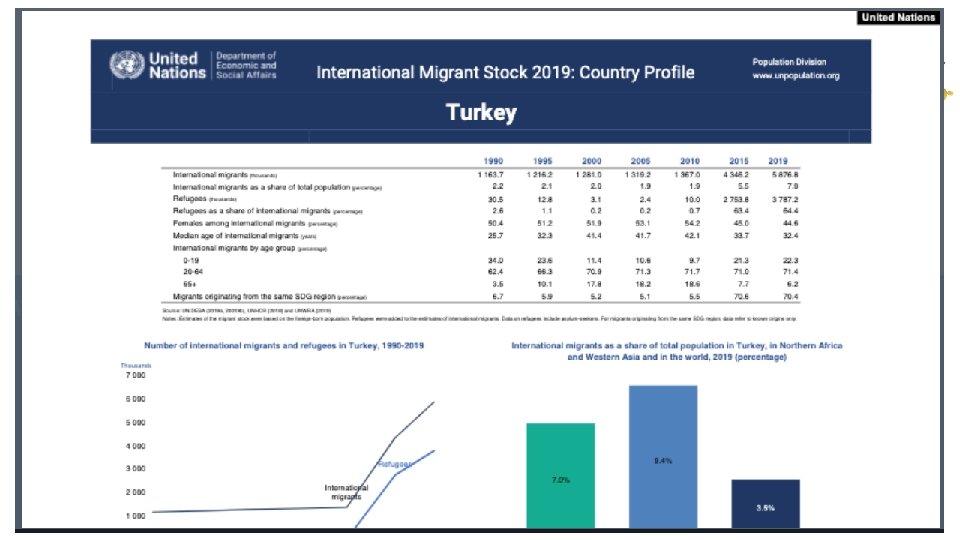 Birleşmiş Milletler’e bağlı Ekonomik ve Sosyal İşler Organizasyonu (DESA), yayınladığı son rapora göre • Türkiye’deki mülteci ve göçmen toplam sayısının 2019 yılına gelindiğinde 5 milyon 678 bin 800 kişiye ulaşmıştır. • 1990 yılında Türkiye’deki mülteci ve göçmen sayısının 1 milyon 163 bin 700 olduğu ancak bu rakamın 2019 yılına gelindiğinde katlanarak arttığı belirtilmiştir.