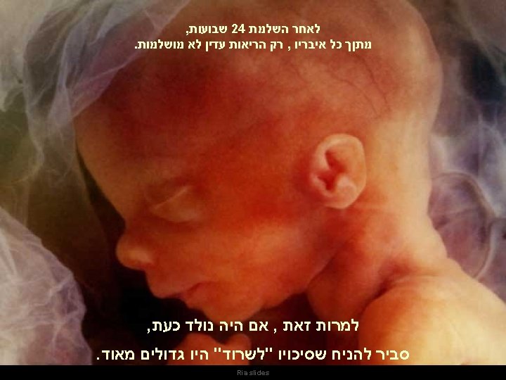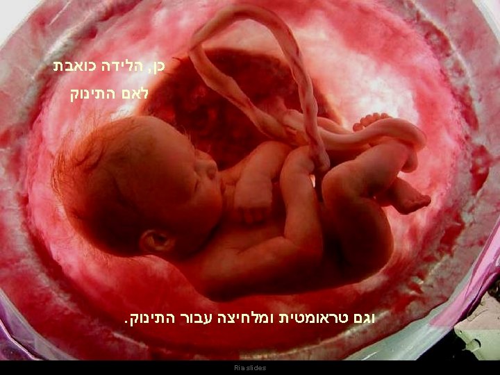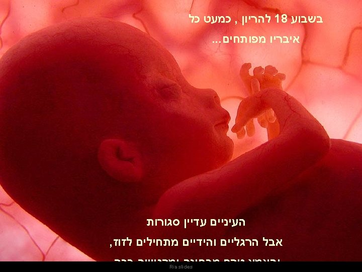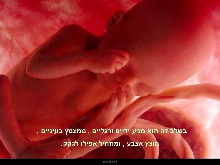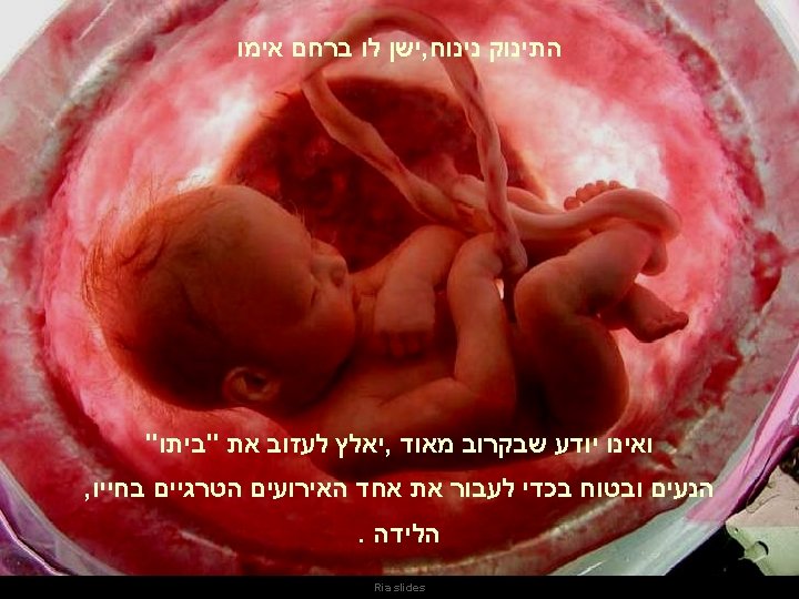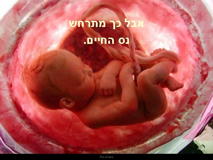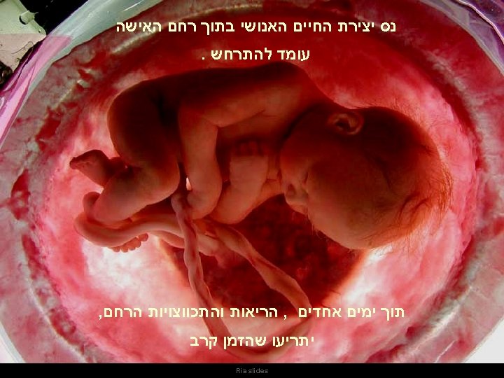 As imagens utilizadas neste pps fazem parte do documentário produzido pelo National Geographic Channel: En el Vientre Materno. São imagens obtidas através de uma micro-câmara introduzida no útero de uma gestante. Graças à modernas técnicas fotográficas é possível acompanhar o fascinante processo de gestação de um bebê. Se deseja ver fotos e vídeos deste documentário, em espanhol, visite o endereço: תורגם לעברית ע"י אלכס מור http: //mujer. terra. es/muj/padres/embarazo/vientrematerno/ Autor do Slide: Ria Ellwanger riaellw@globo. com Texto: baseado nas notas de rodapé das fotos do site acima citado Música: Brahm’s Lullaby - violin Este slide é exclusivo do site Ria Slides Ria slides