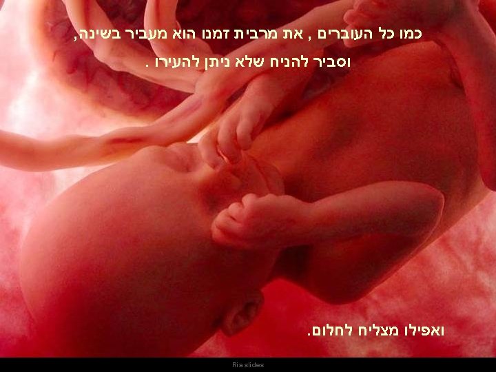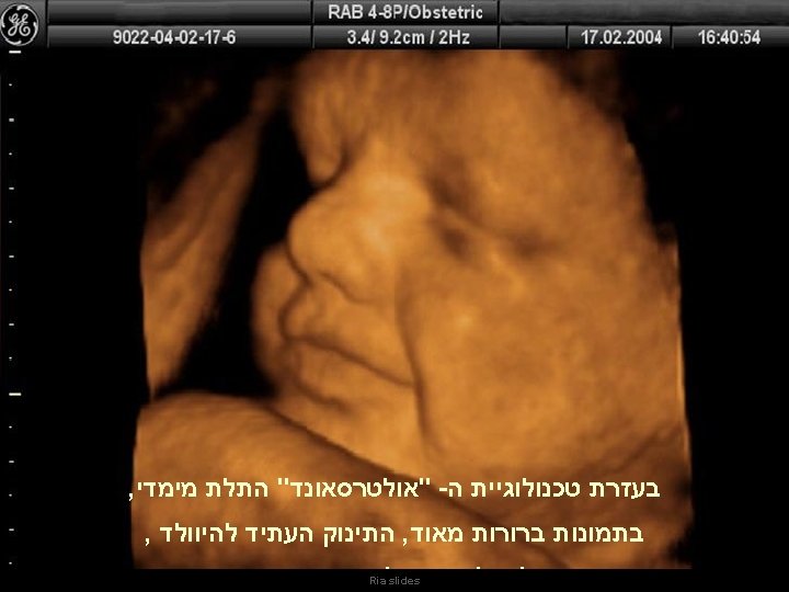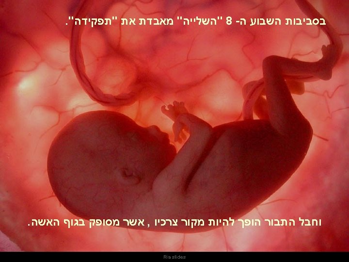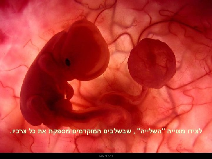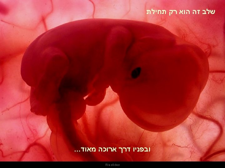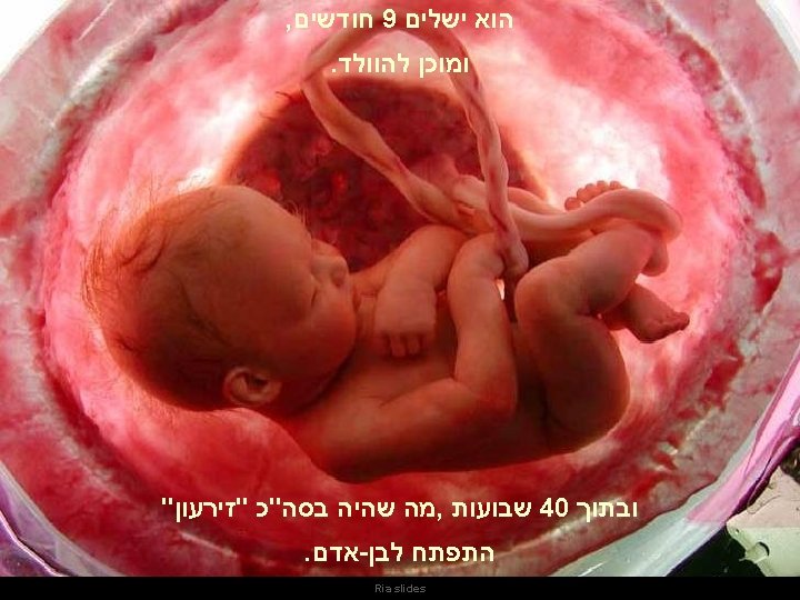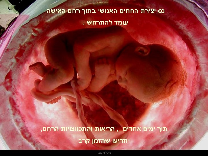 As imagens utilizadas neste pps fazem parte do documentário produzido pelo National Geographic Channel: En el Vientre Materno. São imagens obtidas através de uma micro-câmara introduzida no útero de uma gestante. Graças à modernas técnicas fotográficas é possível acompanhar o fascinante processo de gestação de um bebê. Se deseja ver fotos e vídeos deste documentário, em espanhol, visite o endereço: תורגם לעברית ע"י אלכס מור http: //mujer. terra. es/muj/padres/embarazo/vientrematerno/ Autor do Slide: Ria Ellwanger riaellw@globo. com Texto: baseado nas notas de rodapé das fotos do site acima citado Música: Brahm’s Lullaby - violin Este slide é exclusivo do site Ria Slides Ria slides